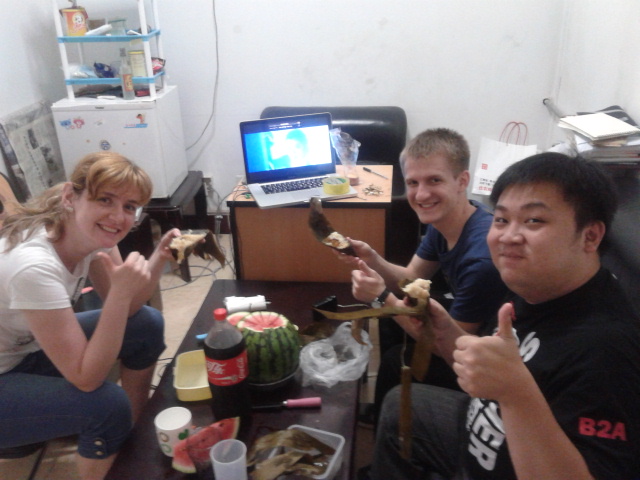 Back to my room, I found out that today my HSK Level 4 result is out and I passed with a flying colors, 260 out of 300. Not bad for a beginner like me, right? And not long after that, Zhang Lin (a Chinese-American friend, my roommate) brought us Beijing Kaoya (Peking Duck) for dinner. Before dinner, the four of us ate Zongzi together, and it was very very delicious. Not because it had some special taste or ingredients, but because it brought us together to celebrate this special day.