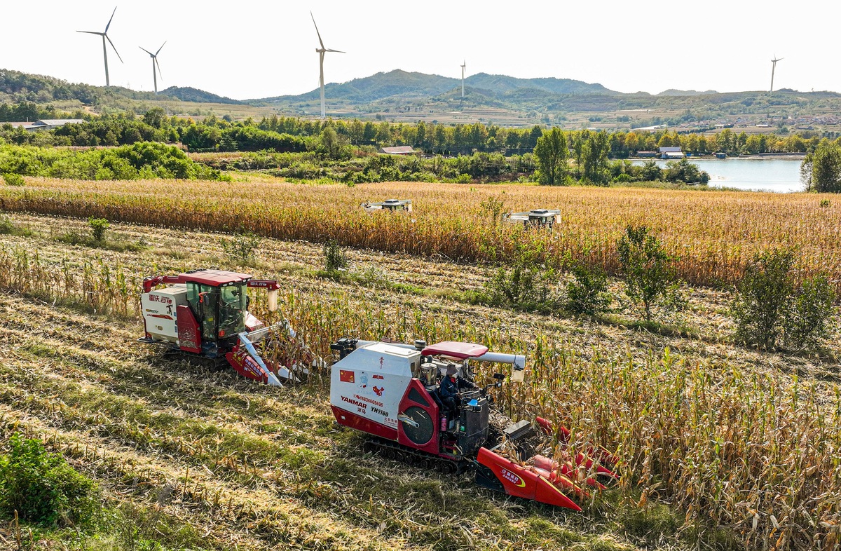 A photo shows harvesters working in the corn field in Dalijia village, Rongcheng city, Shandong province, on Oct 11, 2022. [Photo by Li Xinjun/For chinadaily.com.cn]