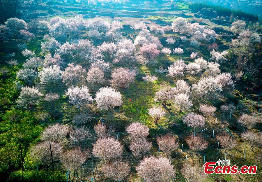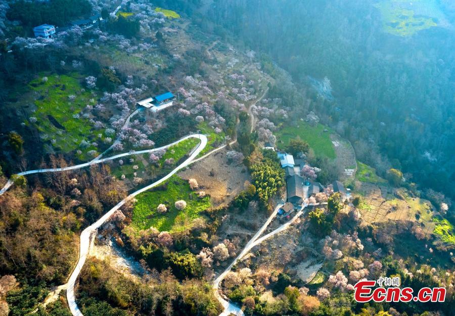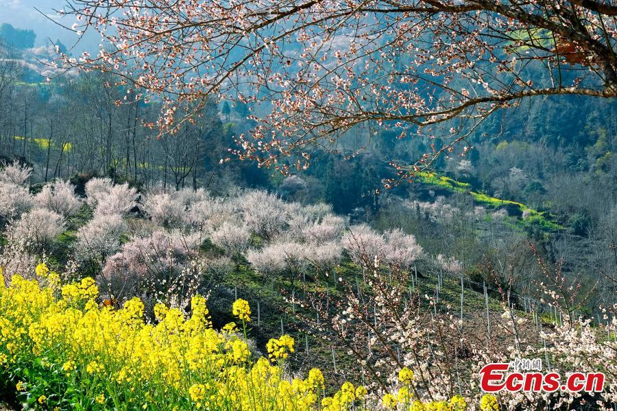 Plum and cole flowers in full bloom along a mountain add colors to a village in Mianyang, southwest China's Sichuan Province. (Photo: China News Service/Hu Yu)